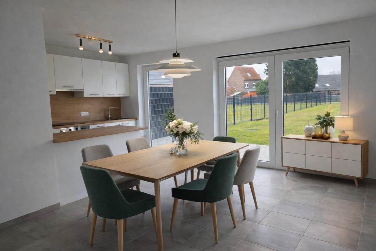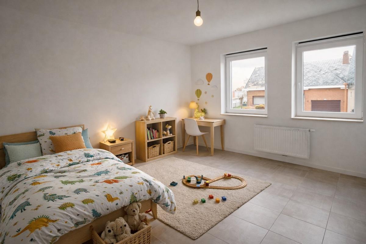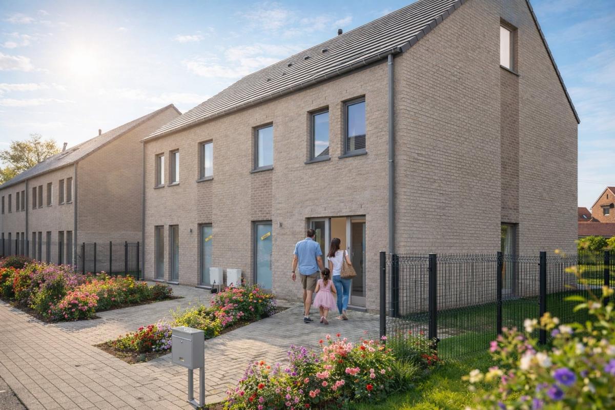 COMPOSITION Rez : hall (+-3,5m²), WC avec lave-main, séjour, cuisine équipée (+-33m²) avec buanderie (+-6m²). 1er étage : hall de nuit (+-6m²), 3 chambres (+-11, 12, 13m²), SDB avec douche (+-7m²), lavabo et wc. Grenier sous combles (+-39m²). Extérieurs : terrasse et jardin – surface habitable : 151m2 INFORMATIONS TECHNIQUES PEB : A - 20250710509237 - 53 kWh/m².an - 7881 kwh/an Égouttage : PVC de diamètre 110 mm. Diamètre de 160 mm depuis la chambre siphonique. Citerne : Eau pluviale : 5000 litres + trop plein vers noue d’infiltration collective. Pré filtre pour la citerne d’eau pluviale. Maçonneries : Portantes en bloc de terre cuite de 14 cm. Bloc d’assise en béton cellulaire. Isolation en PUR de 10 cm (lambda 0,022). Isolation : Entre mitoyens de 2*20mm de laine minérale. Briques Wienerberger Basia Plaza ( WDF – 215*102*65) ton brun et Forum Prata ( WDF – 215*102*65) ton beige avec jointement de 12 mm. Console de reprise de parement au-dessus des châssis en cornières Korbo. Bloc de plâtre pour cloisonnement intérieur. Toiture : Sous toiture, isolant de 22 cm de laine minérale entre chevrons (lambda 0,035 W/mK) et pare vapeur. Tuiles béton (~ 11 pces /m2). Vélux pour les maisons 2 façades. Escalier escamotable. Châssis et portes : Portes et fenêtres en PVC double vitrage. Ug= 1.0. conforme à la PEB. Aérateur dans les fenêtres locaux secs. Membrane d’étanchéité prévue autour des châssis. Seuil en pierre bleue. Murs et plafonds : Enduits au plâtre. PUR projeté de 8 cm (lambda 0,026 W/mK) et chape flottantes. Peinture : Couche de propreté prévue. Sol : Carrelage, Faïences 30/60 cm. Sanitaires : VMC simple flux (extraction locaux humides uniquement). Aérateur dans les fenêtres locaux secs. 2 wc suspendus, lave main, douche, paroi de douche fixe, meuble lavabo, panneau miroir. Chauffage : Chaudière condensation au gaz avec radiateurs avec vannes thermostatiques et thermostat d’ambiance. Production ECS instantanée. Cheminée d’extraction. Panneaux Photovoltaïques : 6 panneaux de 400 Wc. PRIX 295.000€ HTVA + 7.500€ htva (raccordements et frais de géomètre) + commission d'agence de 2% HTVA + honoraires de notaire |