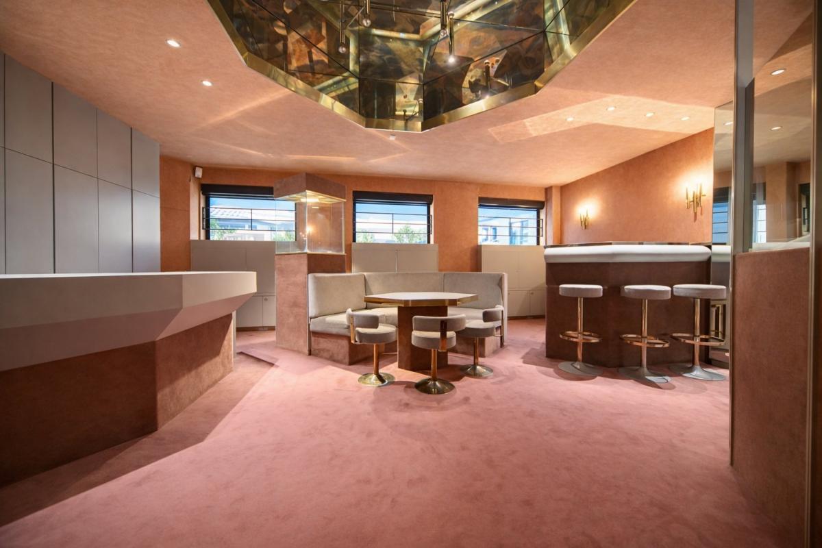 - Pièce avant gauche : 42 m² (6,57 x 6,50 m). Le mobilier est compris : nombreux placards, bureau, vitrines, etc.